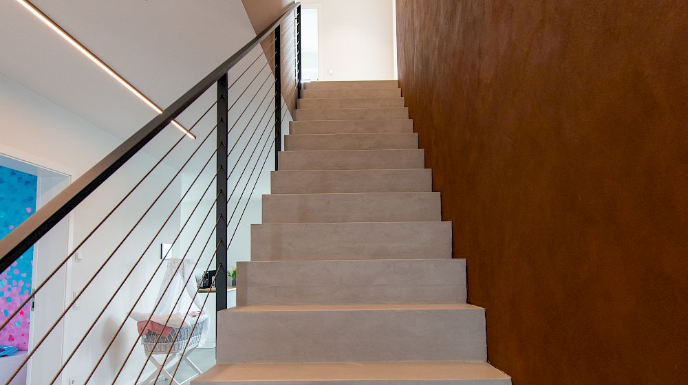 Die Betontreppe wurde mit einer fugenlosen Spachtelmasse veredelt, die sich durch ihre elegante Optik und hohe Widerstandsfähigkeit auszeichnet. Die angrenzende Wand erhielt eine Beschichtung in Echtrost-Technik – eine Oberfläche, die sich im Laufe der Zeit weiterentwickelt und dadurch besonders lebendig wirkt. Beide Materialien wurden in Farbe und Textur sorgfältig aufeinander abgestimmt.
