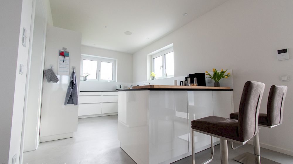 Die Küche war nicht nur optisch ein Highlight – auch technisch hatte sie ihre Tücken. Mit rund 100 m² zusammenhängender Bodenfläche stellte das Projekt hohe Anforderungen an Planung und Ausführung.