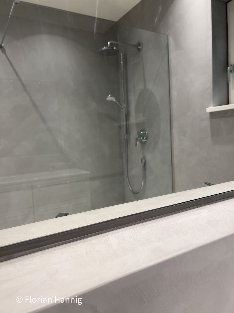 Die Aufgabe: Ein modernes Bad gestalten, das sich nahtlos in den hochwertigen Altbau einfügt – zurückhaltend im Design, aber stark in der Wirkung. Die Entscheidung fiel auf eine fugenlose Oberfläche, die durch ihre reduzierte Optik perfekt zur historischen Architektur passt. Gleichzeitig bringt sie klare Vorteile im Alltag: pflegeleicht, langlebig und absolut zeitlos.