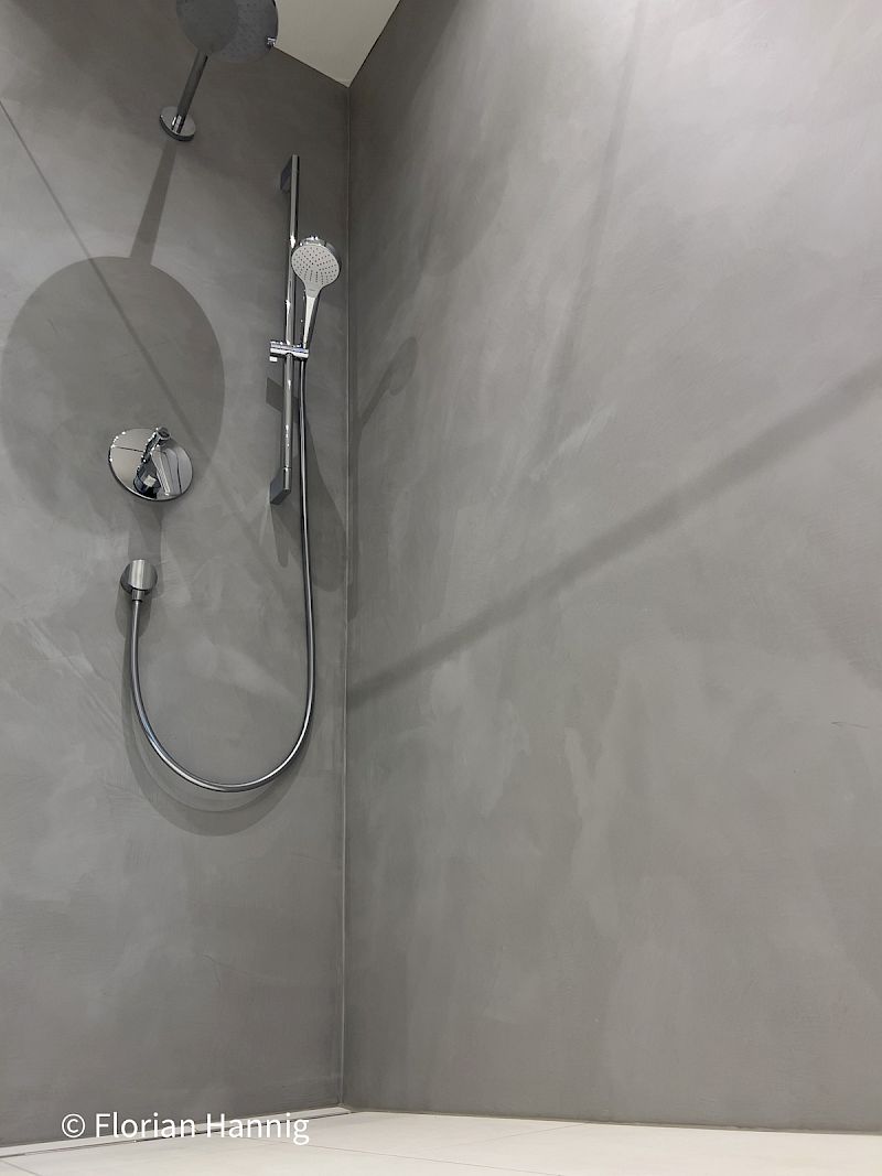 Die Wahl des Materials fiel auf BaseBeton, einen hochwertigen Mikrozement von Stonege. Die Farbe Lin – ein elegantes, helles Steingrau – wirkt natürlich und ruhig, ohne kühl zu erscheinen. Gerade in Kombination mit der historischen Bausubstanz entsteht so eine wohnliche Atmosphäre, die reduziert, aber nicht steril ist.